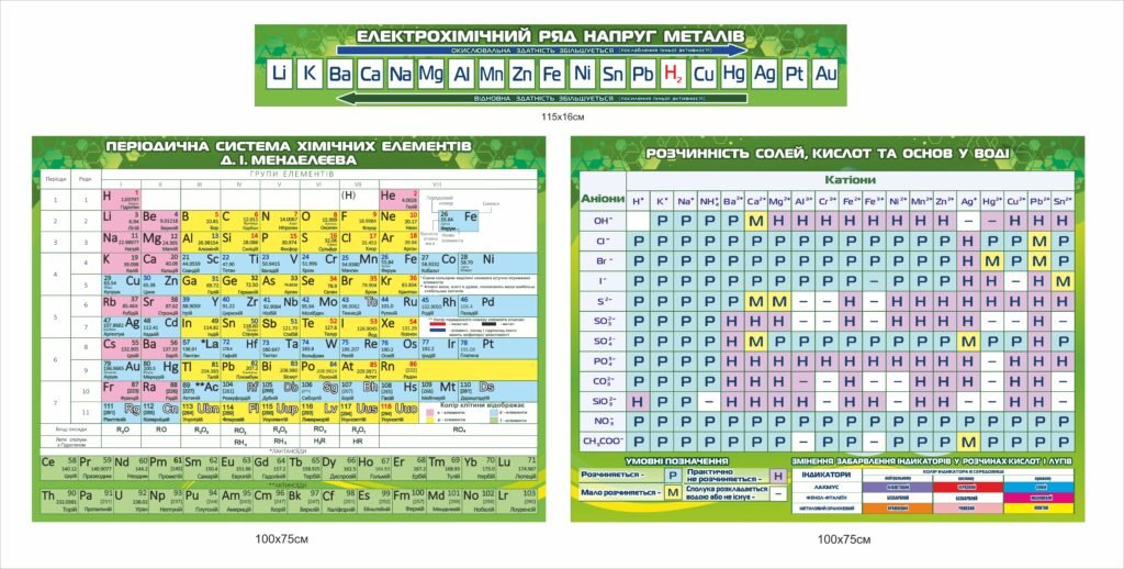 Замовити – Комплект стендів “Електрохімічний ряд напруг, періодична система елементів Д.І. Менделєєва, Розчинність солей, кислот та основ у воді” – osvitjanyk.dp.ua