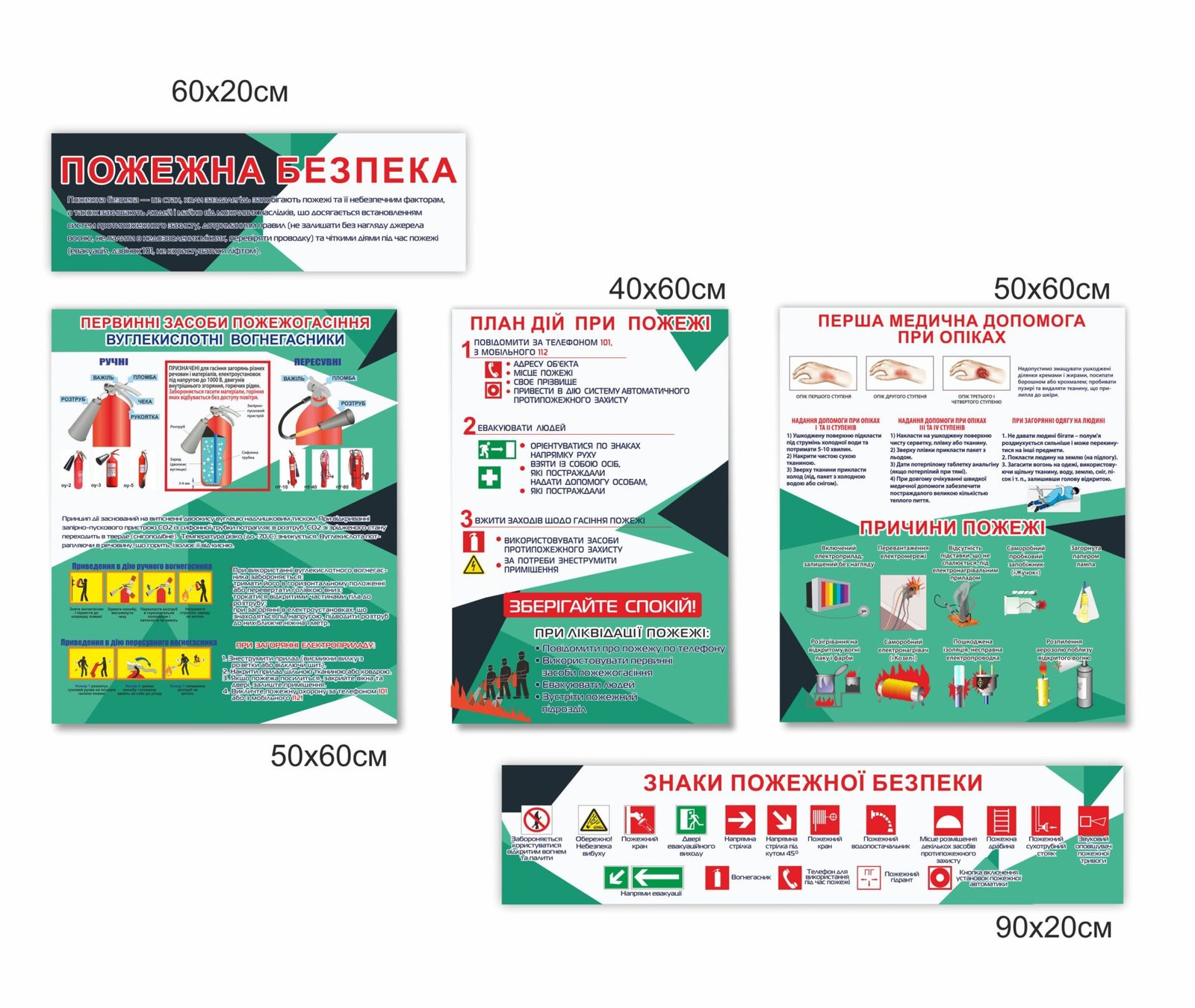 • Стенди “Пожежна безпека”: первинні засоби пожежогасіння, план дій при пожежі, перша медична допомога при опіках, знаки пожежної безпеки