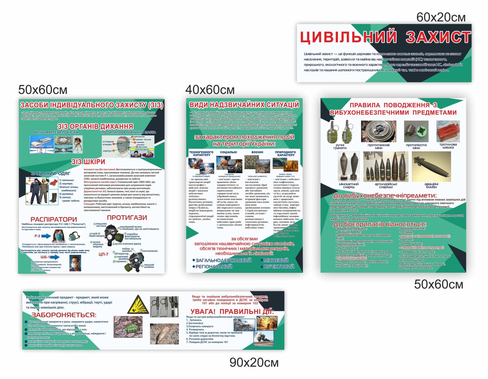 • Стенди “Цивільний захист”: засоби індивідуального захисту (ЗІЗ), види надзвичайних ситуацій, правила поводження з вибухонебезпечними предметами
