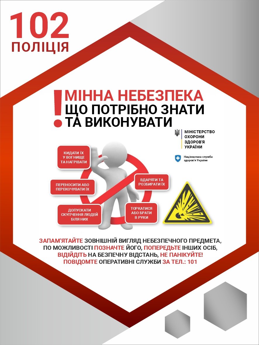 - Основний зміст: Інформація про важливість дотримання техніки безпеки на робочому місці, основні правила поведінки та дії при виявленні вибухонебезпечних предметів. Контактний номер поліції 102.
