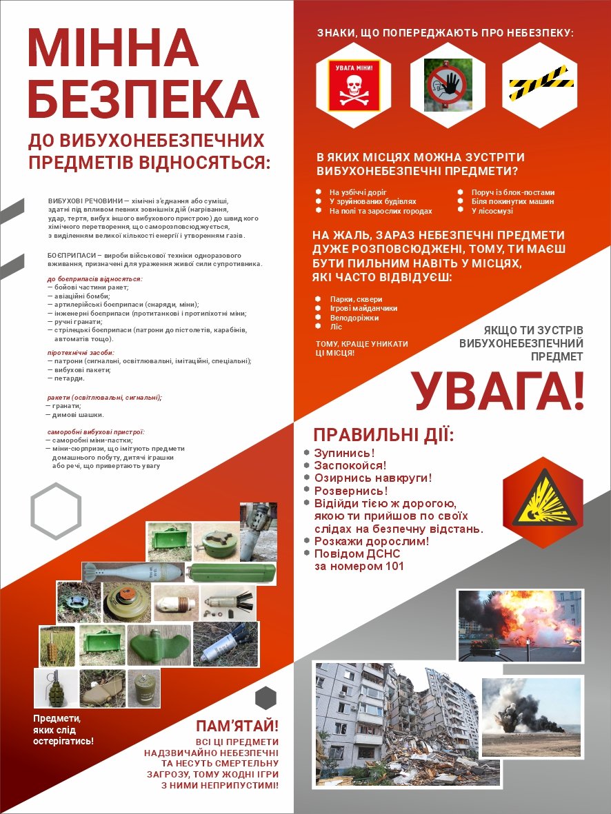 - Основний зміст: Правила поведінки при виявленні мін або вибухонебезпечних предметів, опис видів мін та способів їх виявлення. Контактні номери екстрених служб.