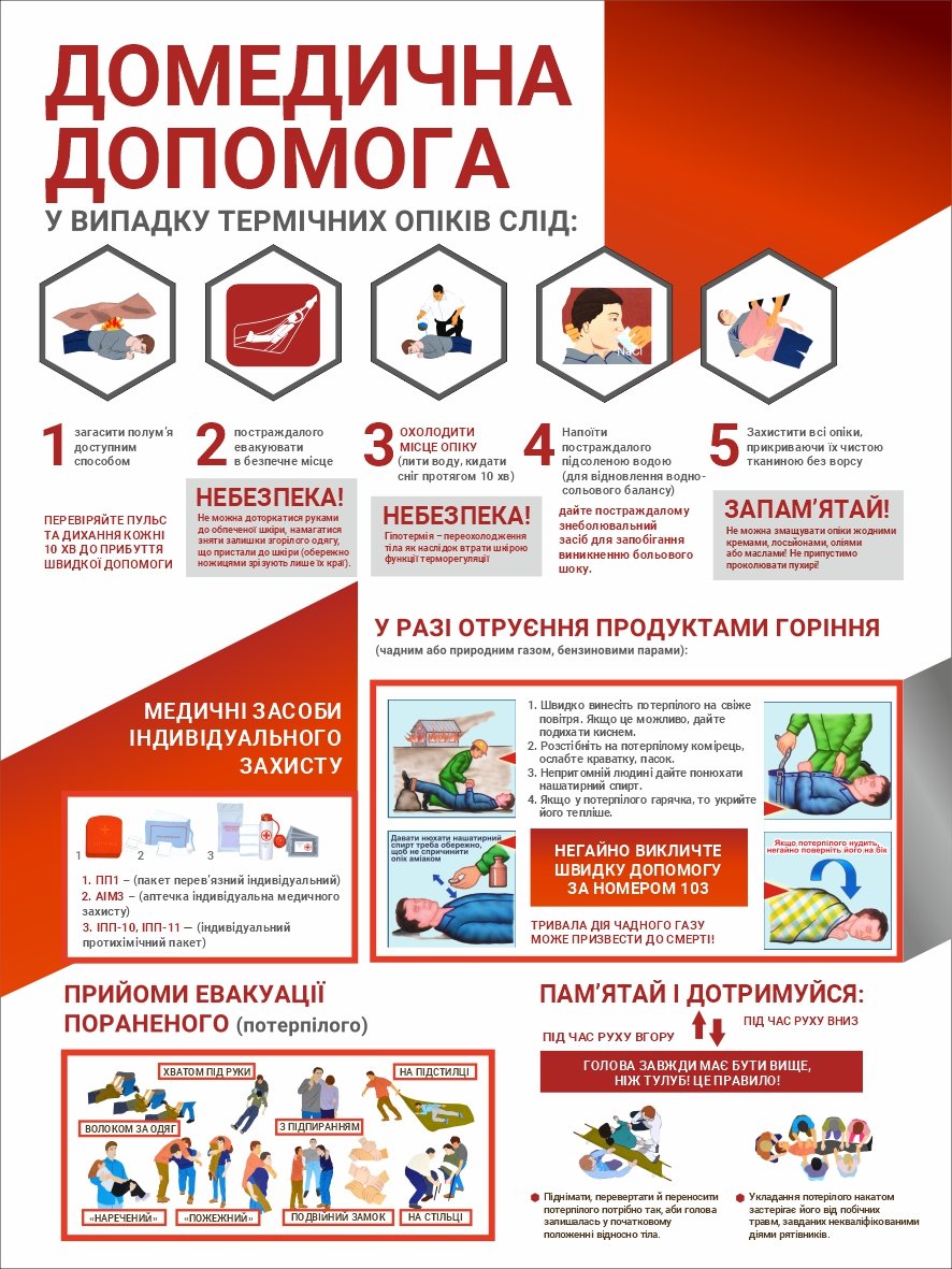 - Основний зміст: Інструкції з надання домедичної допомоги при термічних опіках, опис ступенів опіків та першочергові дії. Рекомендації щодо використання засобів захисту.