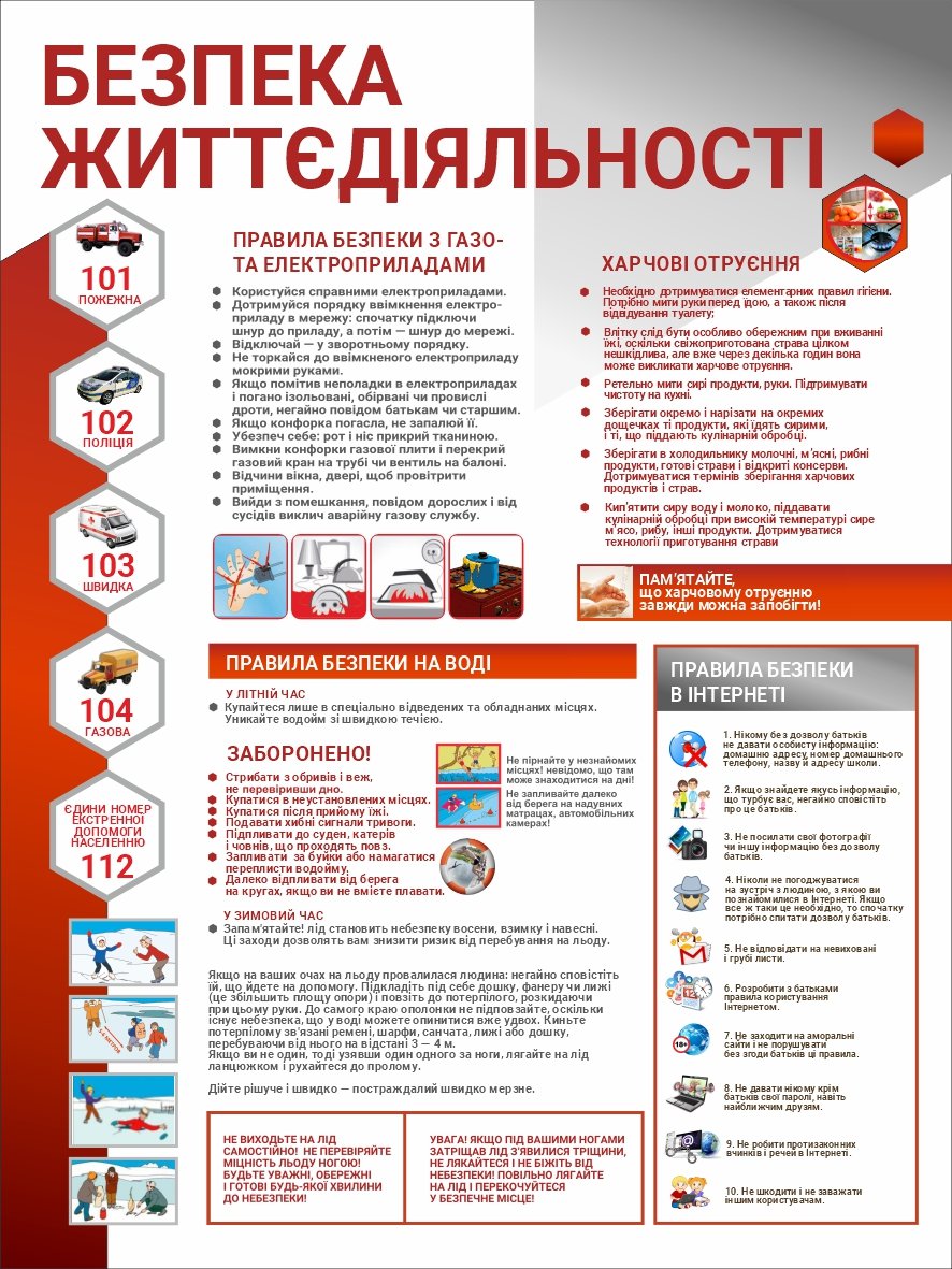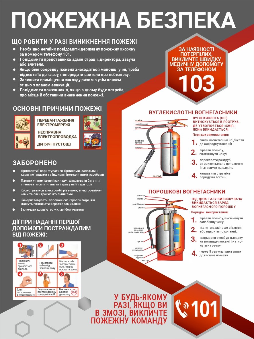 - Основний зміст: Правила поведінки у разі виникнення пожежі, основні причини пожеж та заходи щодо їх запобігання. Контактний номер пожежної служби 101.