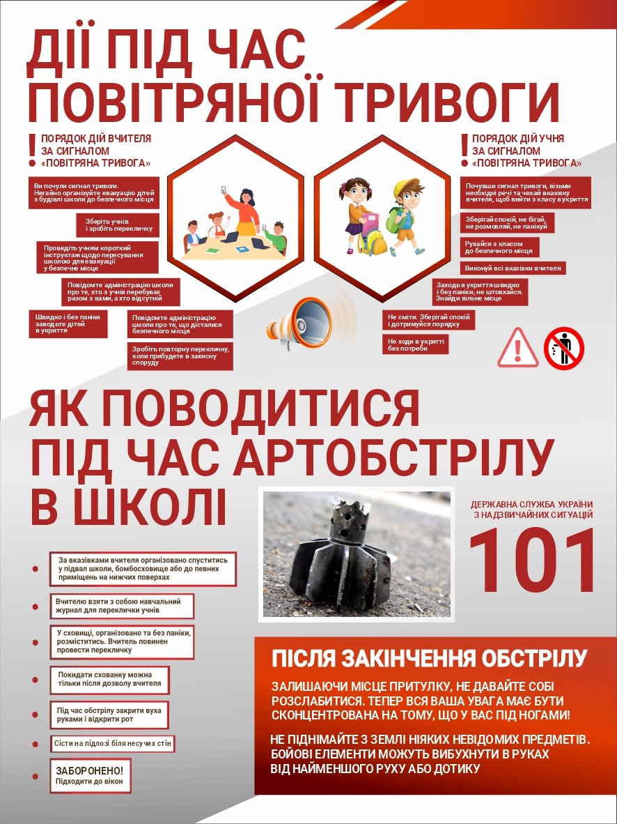 - Основний зміст: Правила поведінки під час повітряної тривоги, дії під час артобстрілів у школі, порядок евакуації. Контактні номери екстрених служб.