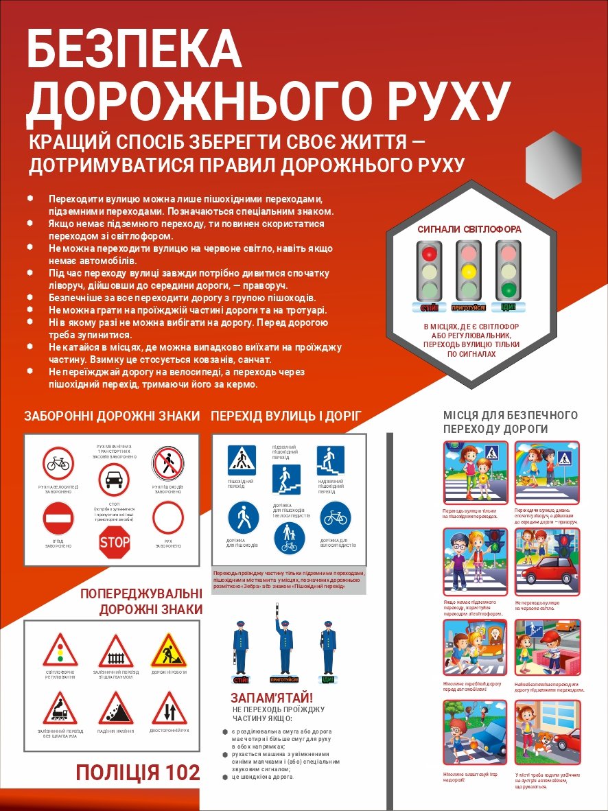 - Основний зміст: Правила безпеки дорожнього руху для пішоходів та водіїв, попереджувальні знаки та інструкції щодо безпечного пересування. Контактний номер поліції 102.