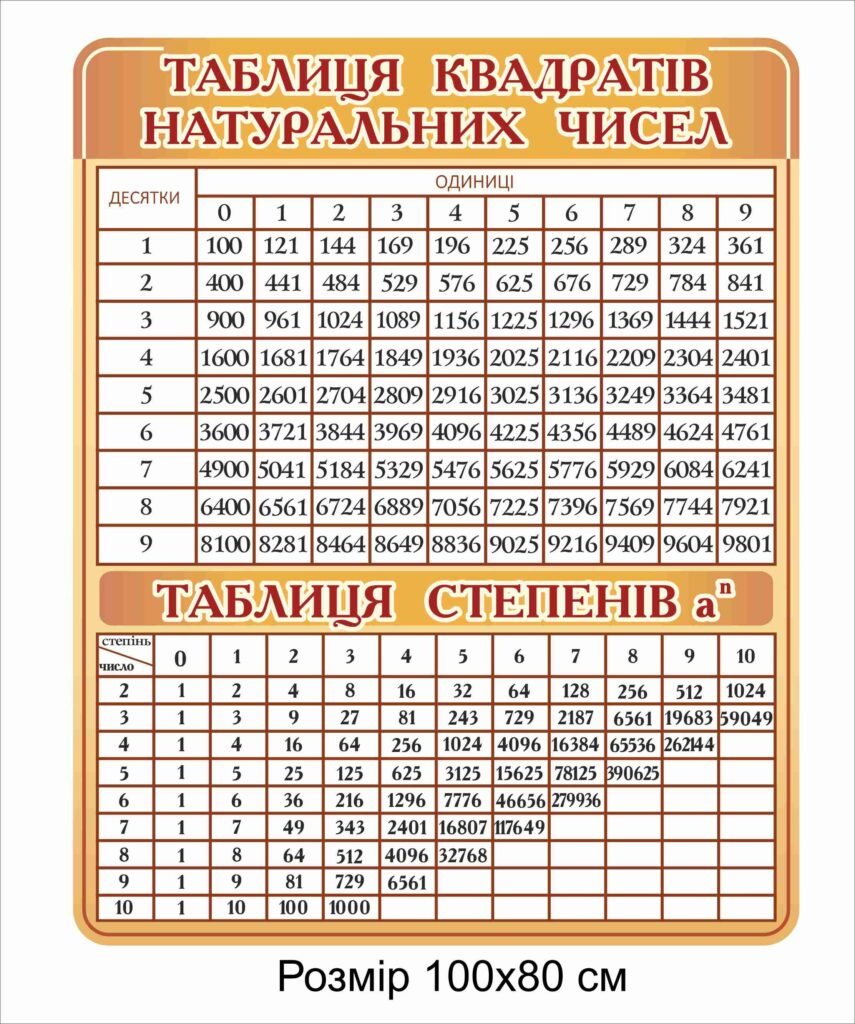 Стенд “Таблиця степенів та квадратів натуральних чисел” – чудовий наочний посібник для оформлення шкільного кабінету математики