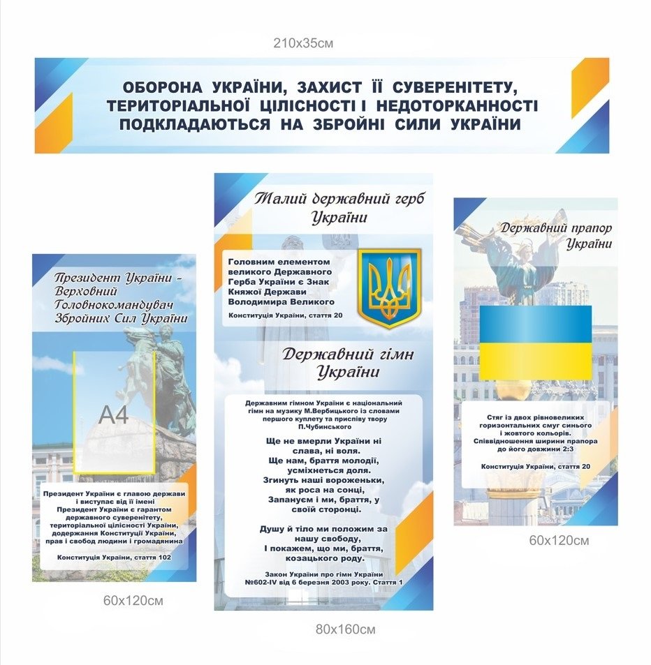 Усі представленні стенди виготовлені з високоякісного ПВХ (пластику) товщиною 3мм, який вкривається плівкою з повнокольоровим друком. «Кармани» з прозорого пластику ПВХ товщиною 0.4мм.