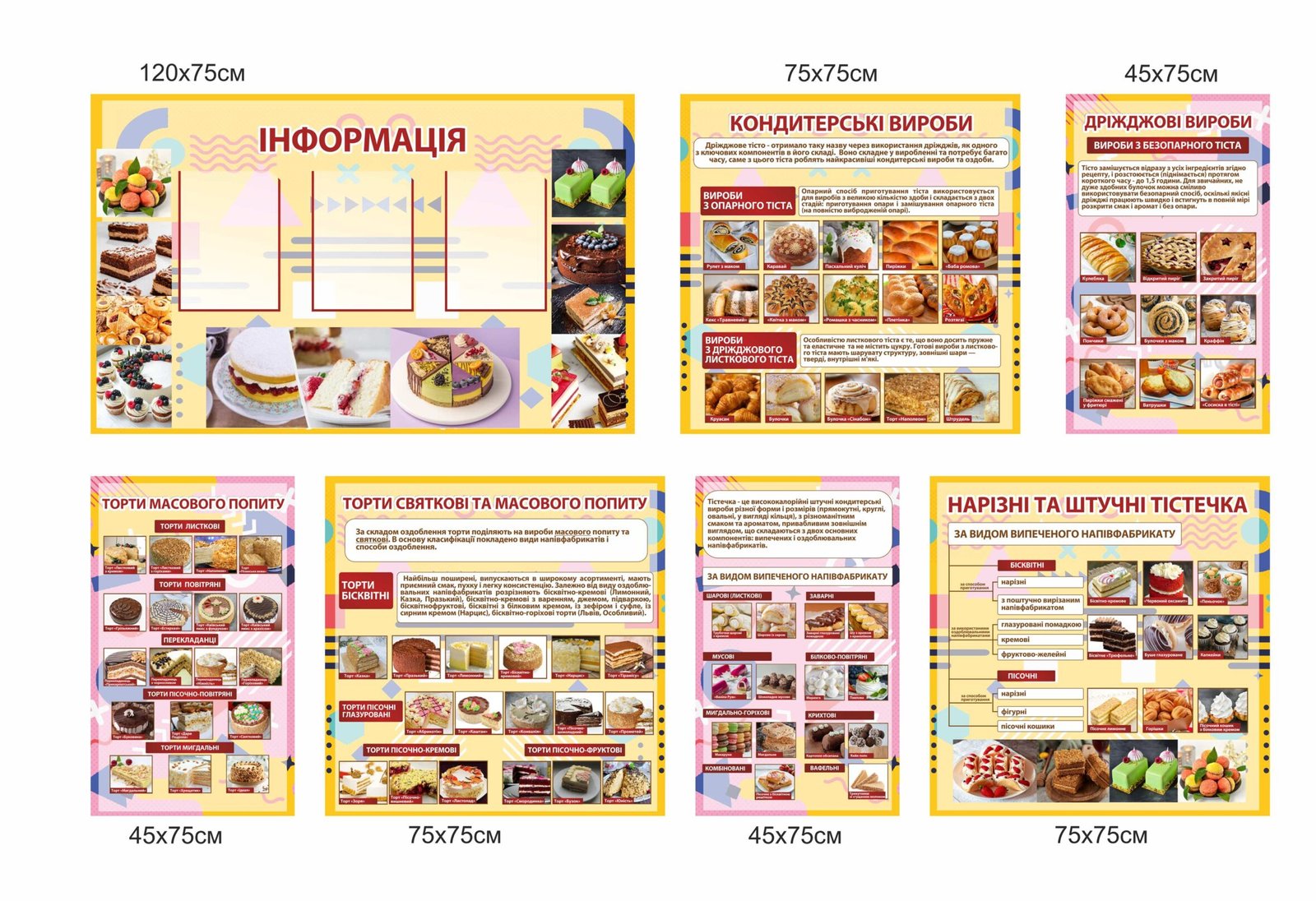 Стенд «Торти святкові та масового попиту» – бісквітні, пісочно-глазуровані, пісочно-кремові, пісочно-фруктові торти
